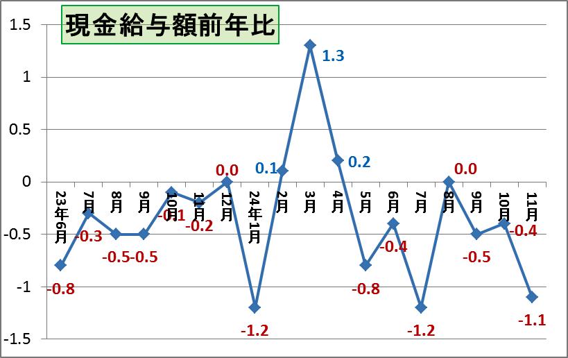 厚生労働省が平成24年11月の月間現金給与額を発表しました。11月の現金給与は前年比で▼1.1%と前年同月より減りましたが、24年5月以降の7ケ月連続でのマイナスとなり、給与の減少傾向は続いていることがわかります。