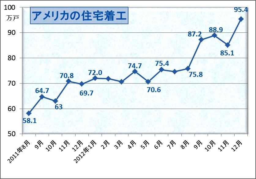 アメリカの商務省がアメリカの住宅着工の2012年12月を発表しました。