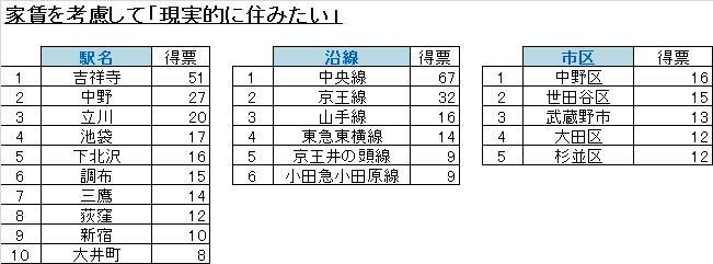 東京都在住の20代の男女に、「家賃を考慮して、現実に住みたい」ところを聞いてみると、一番住みたい駅は「吉祥寺」で、路線は「中央線」、市区は「中野区」となりました。