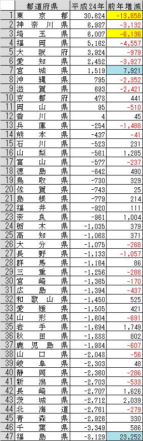 転出超過県では、被災地県が転出数を減らしていますが、それ以外では長崎県が前年から1626人減らしています。これは、工場などの移転があるためです。