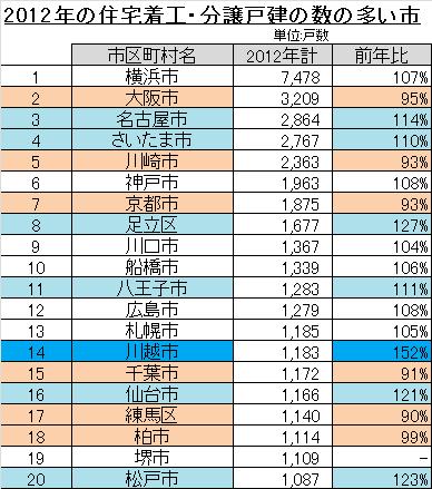 国土交通省が集計している住宅着工統計の分譲戸建の市区町村別を2012年1月から12月の年集計をして、上位の市区トップ20をみてみると、一番戸数の多かったのは横浜市で、前年よりも一番伸びたのが川越市でした。