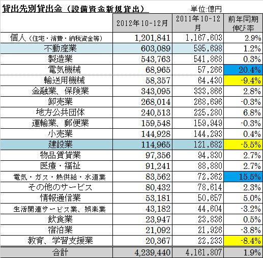 このように2012年10月から12月の新規資金貸し出しをみると、+1.9%増えてはいますが、実態は+0.9%増加にとどまります。