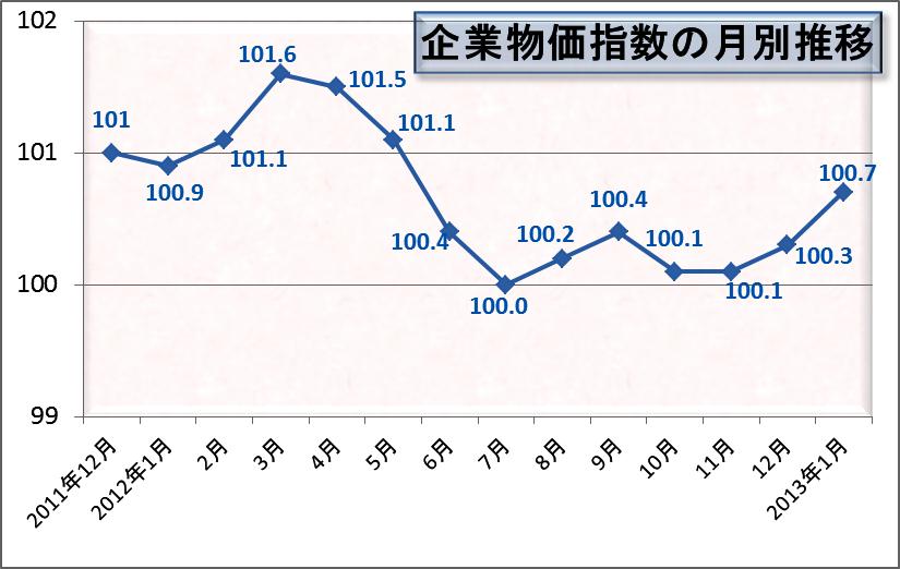 それが11月までは100.0前後で推移していましたが、12月に100.3とやや上げて、2013年1月には100.7とさらに上昇しました。