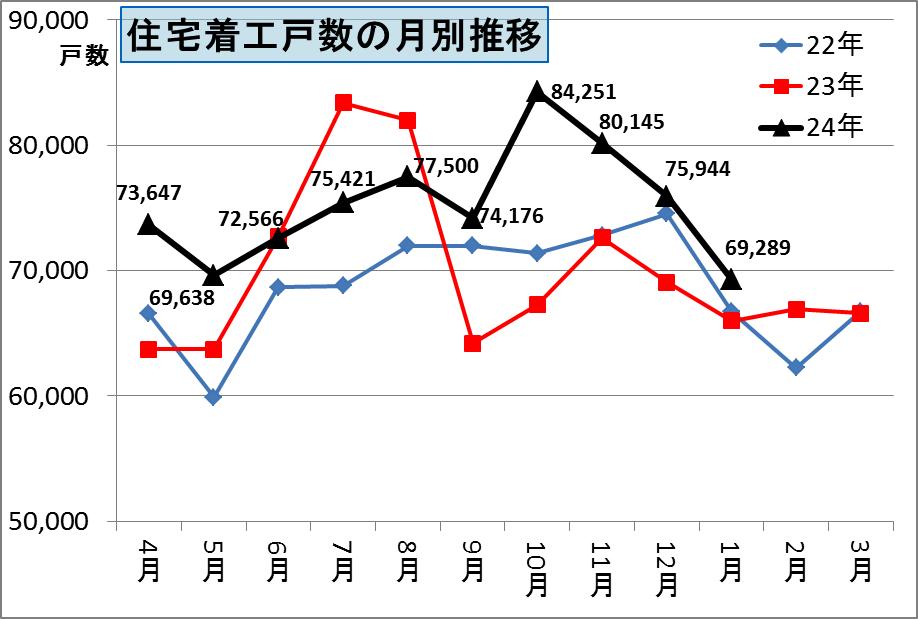 そのため平成24年度の年間の着工戸数は86万戸+消費税駆け込み着工となり89万戸前後で落ち着くとみられます。