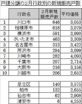これら好調組と対照的なのがトップ10から東京都が姿を消しました。従来販売戸数が一番多かった足立区が140戸と従来の半分となるなど軒並み減らしています。一つは土地価格が上がっているために販売価格があがつてきていることがあります。足立区も2月の新規販売は3575万円と昨年には3300万を割ったところから200万以上上がってきました。