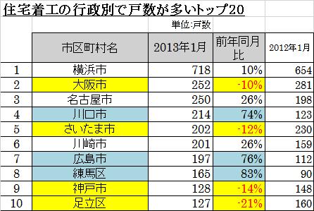 平成25年1月の住宅着工の分譲戸建の行政別のトップ10を集計してみると、震災の影響がまだあり、比較的に震災被害予測が低いところが大きく増えています。やはり、液状化や不同沈下などで住めなくなるリスクを避けている傾向がみてとれます。