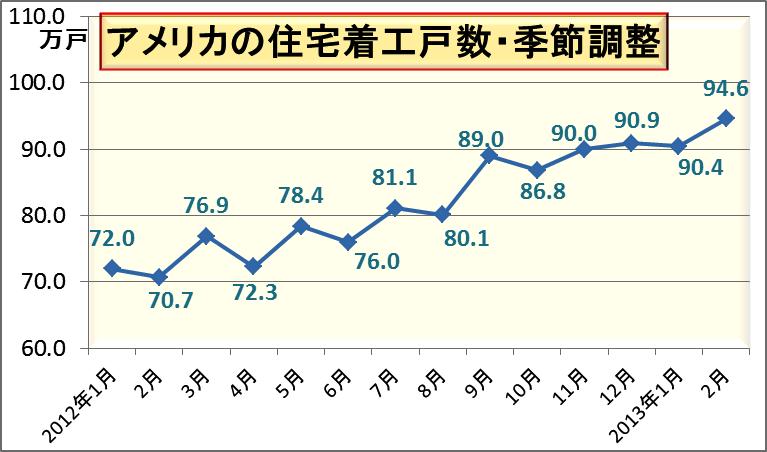 アメリカの商務省よりアメリカの住宅着工統計の2013年2月が発表されましたが、季節調整値で94.6万戸で直近の最高値を更新し、前年同月比で+33.8%と大きく伸び、前月比でも+4.6%と増えています。