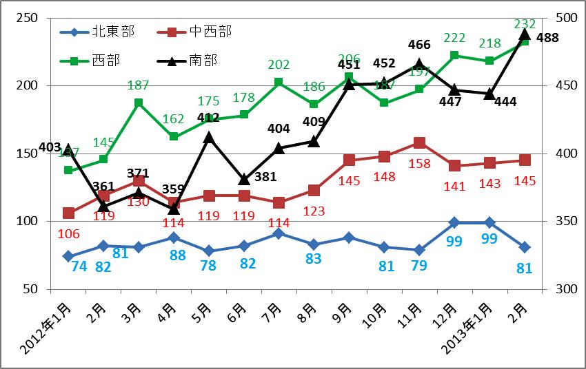 南部が一番多くて48.8万戸となっています。昨年2月が36.1万戸でしたから+12万戸も増えています。また12月・1月とやや減りましたが2月は直近の最高となりました。