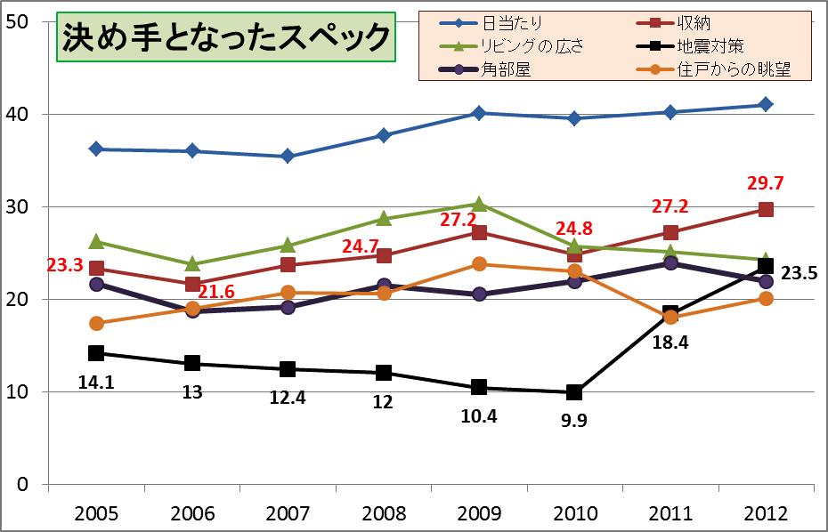 そして、三番目に「地震対策」が上がってきました。2010年には9.9%まで落ちたのですが、東日本大震災により上がり始めて2012年は23.5%まで上がりました。