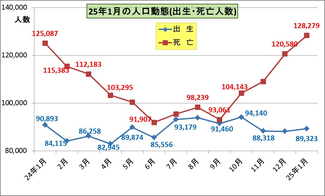 死亡は冬場が多いために昨年1月に平常時の直近の最高人数の12万5087人となった後は夏場にかけて10万人を下回りました。ただ、出生人数を下回ることはなくて毎月人口減少は続いてしまっています。そして秋から冬にかけて死亡人数は増えて平成25年1月には12万8279人となり平常時の直近の最高であった平成24年1月を上回りました。