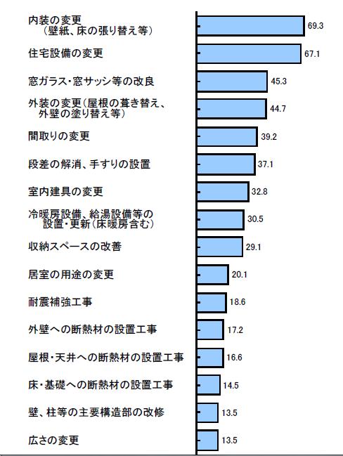 一番は壁紙の変更などで69.3%です。これは比較的安易で低価格なために、他のリフォームと同時にやることが多いために69.3%と高くなっています。