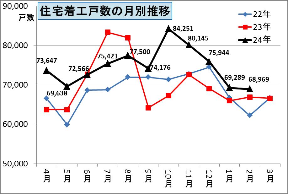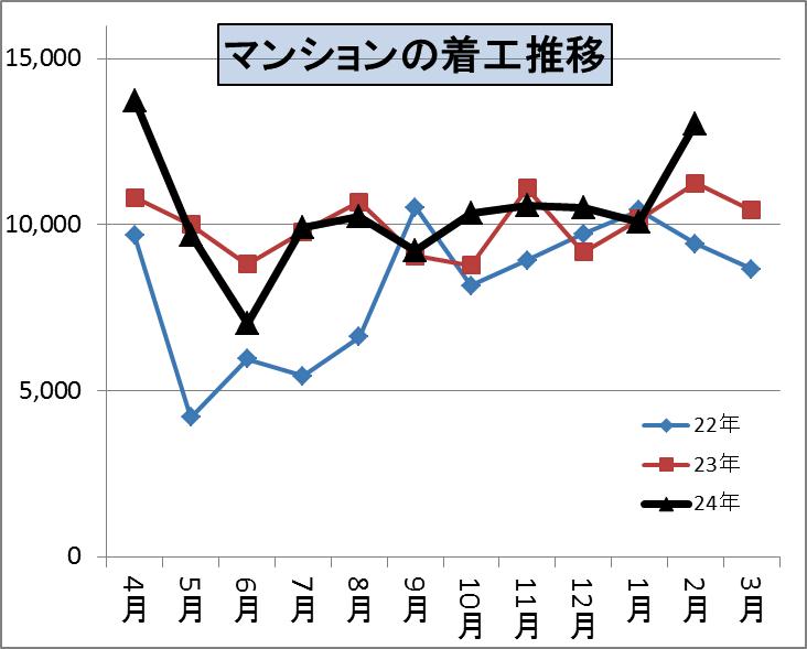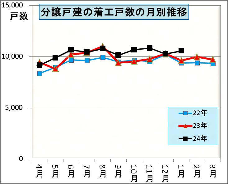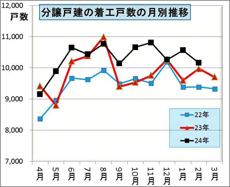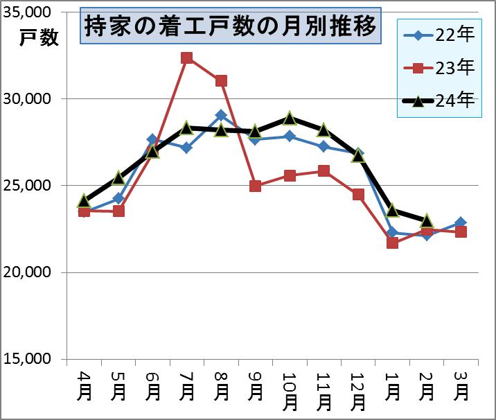 これは昨年度の7月・8月が住宅エコポイントの駆け込みとフラット35Sの駆け込みにより大きく増えたために、9月以降がその分少なくなってしまい月別の動きが異常であったために、平成22年度の月別推移に近くなっているのです。