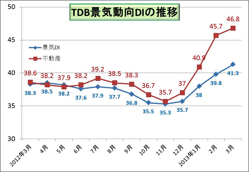 帝国データバンクは「TDB景気動向DI」の2013年3月を発表しましたが、3月は41.3ポイントなり前月の39.8ポイントから1.5ポイント上がりました。