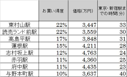 すると東村山駅と読売ランド前駅がお買い得度22%で一番お買い得となりました。その他で10%以上お買い得となったのが6駅でした。
