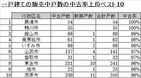 その他、販売中戸数のベスト10で中古率が高いのが千葉市63%となっています。