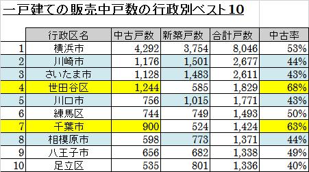 しかし4位の世田谷区は中古一戸建てが1244戸ですが、新築一戸建て分譲が585戸と半分以下になっていて中古率は68%と高くなっています。新築一戸建てが少し少ないということもありますが、中古一戸建てが1244戸と多くて、横浜市に次いで2位と多くなっています。その中古一戸建ての販売平均価格は9300万円となっています。1億円以上の物件が300戸以上あるなどですが、やはり少し高めです。それに対して新築一戸建ては6153万円と比較的安くなっています。つまり、新築一戸建ては比較的安くなっていて回転が良いために販売中在庫が少ないといえて、中古一戸建ては高いために回転が遅くて販売中戸数が増えているといえます。
