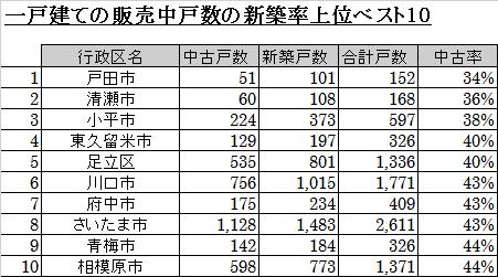 同じく3位のさいたま市も中古率が43%なので新築一戸建て分譲の供給が活発です。