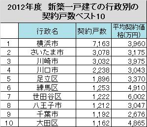 アトラクターズラボの戸建分譲データベースの集計により、2012年度(2012年4月から2013年3月)の行政別の契約戸数を集計してみると、一番多かったのは横浜市で順当でしたが、10位争いが僅差で大田区が入りました。そして千葉県からは1市のみで柏市などは順位を上げられていません。