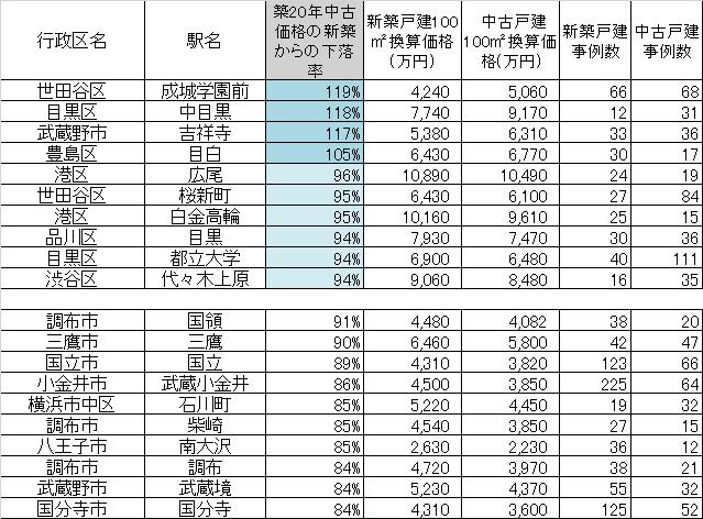 新築戸建てが20年したら価格はどの程度下落するかを駅別に集計してみると、東京23区で都心に近い駅は中古になっても下落していなことがわかりました。