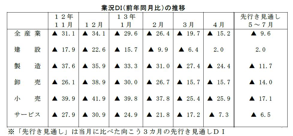 この業況DIは全国の商工会議所が3116企業にコヒヤリングした結果です。その4月の結果としては▼15.2でした。基準がゼロなので依然として景気は良くないことになりますが前月よりも4.5ポイント改善しました。昨年11月からは▼16ポイントも大きく改善しています。
