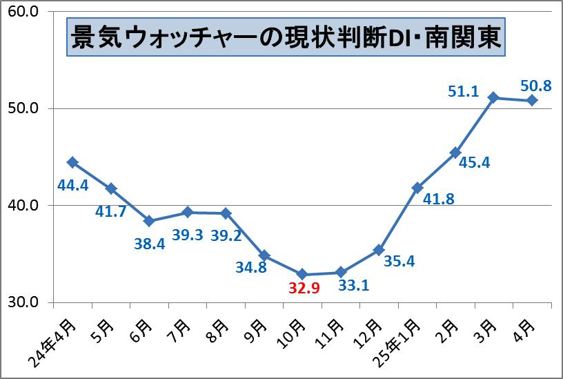その中の指標である「景気の現状水準判断DI」の南関東は50.8となり前月より▼0.3ポイント下がりました。