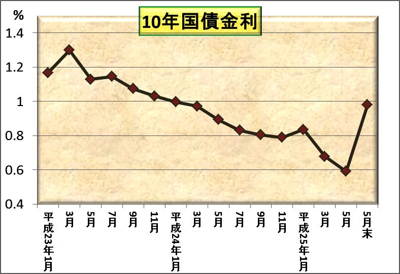 今年に入り08%を切って文字通り「市場最低金利」水準であったのが、5月9日以降に突然急騰しだして、日銀の火消しもなんのそので、とうとう1%を超えました。
