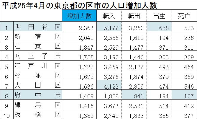 一番増えたのが世田谷区です。流入が5177人と一番多かったのが要因です。また出生数も658人と東京都で一番です。日本を代表する住宅地としての面目躍如というところです。