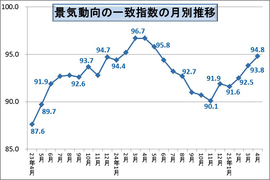 内閣府が平成25年4月の景気動向指数ほ発表しました。4月の一致指数は94.8で前月から+1.0ポイント増えて、5ケ月連続で想増加して景気が回復していることがみてとれます。