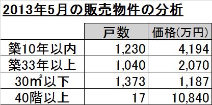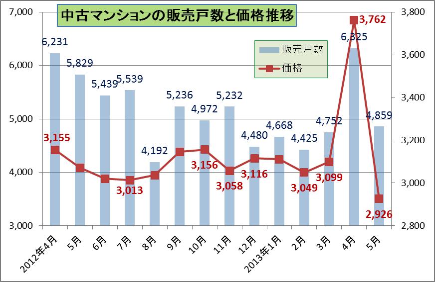 昨年からの推移をみると、2012年4月に6231戸であったのが毎月減っていき、2013年2月には4425戸まで▼2000戸も減りました。それが4月に大きく増えましが、これは新築の1年超え物件が中古にカウントされてきたもので、高額物件が多かったために平均価格も大きく上昇しました。それが5月には大きく減り4859戸と3月よりやや多い戸数に戻りました。