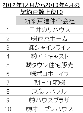 昨年12月から4月までの東京都の新築一戸建ての契約は1万4000戸となっていますが、大半は仲介店による契約となっています。その中での上位店を集計してみると、三井のリハウスや東急リバブルなど大手は入ってますが、多くは独立系で特定エリアで強い会社が多くなっています。