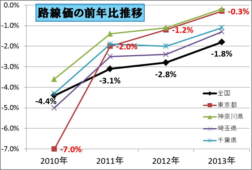 こ国税庁より2013年度の路線価が発表になりました。2013年度の全国は前年度比▼1.8%となり、2012年度の前年度比▼2.8%から改善されました。このままであればあと2年くらいでプラスに転換し、デフレ脱却となる見込みとなりました。