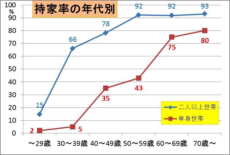 それが単身世帯の30歳代がわずか5%と大きくへこんでいます。これは単身世帯の60歳以上が持家率75%となっていることより、持家志向は二人以上世帯とそうはかわらないと言えます。