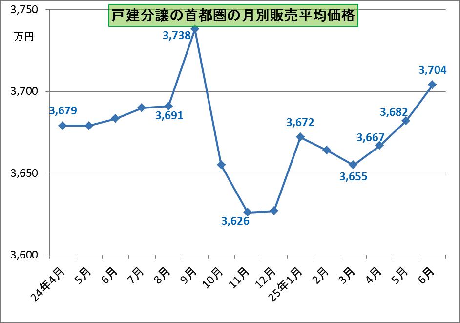 6月の首都圏の販売されたもの全ての平均可価格は3704万円となり前月より+22万円上がり、前年同月からは+21万円上がりました。