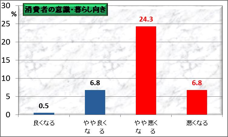 回答者が暮らし向きについて「やや悪くなる」と答えた回答率が24.3%と圧倒的に高くなりました。「やや良くなる」と「悪くなる」が6.8%ですので四倍近い回答となっています。グラフからは抜きましたが、「変わらない」が61.6%と大半は変わってはいないのですが、「やや悪くなる」24.3%と「悪くなる」6.8%を合わせた26.1%が、暮らし向きが悪化していると回答しています。