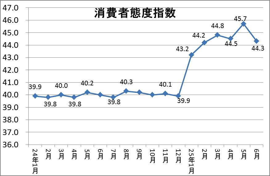 一般消費者が暮らし向きなどをどう感じているかを調査している「消費者態度指数」の平成25年6月が内閣府より発表されました。それによると6月は44.3ポイントで前月より▼1.4ポイント下がりました。今年1月に急上昇して以来の下降となりました。