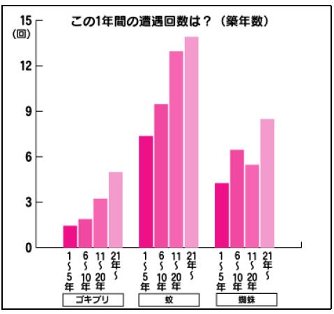 このグラフをみる通り、ゴキブリや蚊などの虫トラブルは築浅が少なくて、築21年以上が多くなるというわかりやすい傾向となりました。