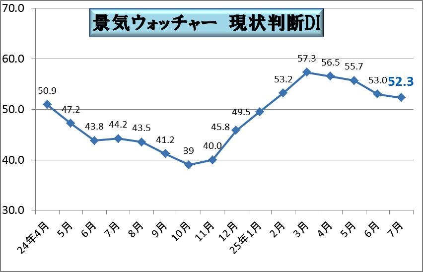 内閣府が景気動向を街角視点で調査している「景気ゥォッチャー調査」の7月が発表されましたが、今現在の景気をどう思っているかの「現状判断DI」が52.3となり前月より▼0.7ポイント下がりました。これで4月以降の4ケ月連続で前月比でマイナスとなり、企業業績の景気回復はしていますが、街角景気は下降していると言えます。