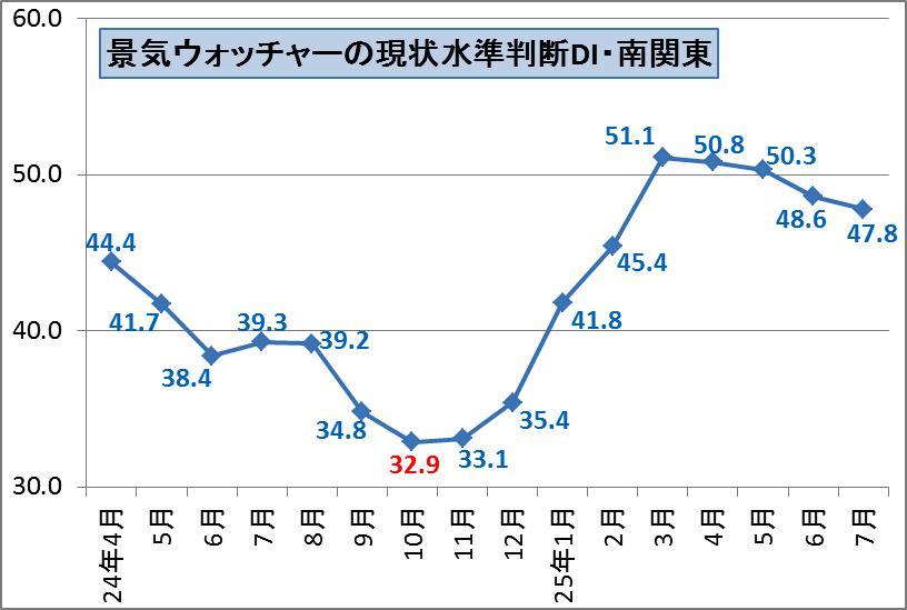 南関東の現状水準判断DIは6月にすでに50ポイントを割り、7月は47.8ポイントまで低下しました。