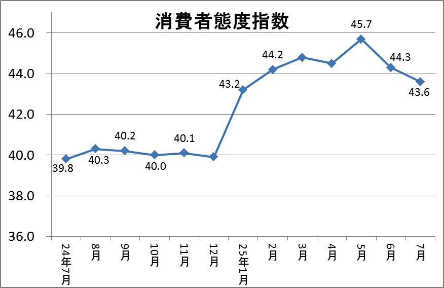 内閣府が消費動向を調査する「消費態度指数」の平成25年7月を発表しました。その消費態度指数は43.6ポイントで前月から▼0.7ポンイト下げるとともに2ケ月連続で下げました。