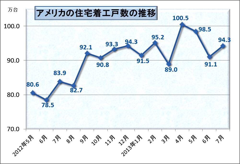アメリカ商務省よりアメリカの住宅着工の2013年7月分が発表されましたが、年換算で94.3万戸で前年同月比+12.4%・前月比+3.5%と増えました。