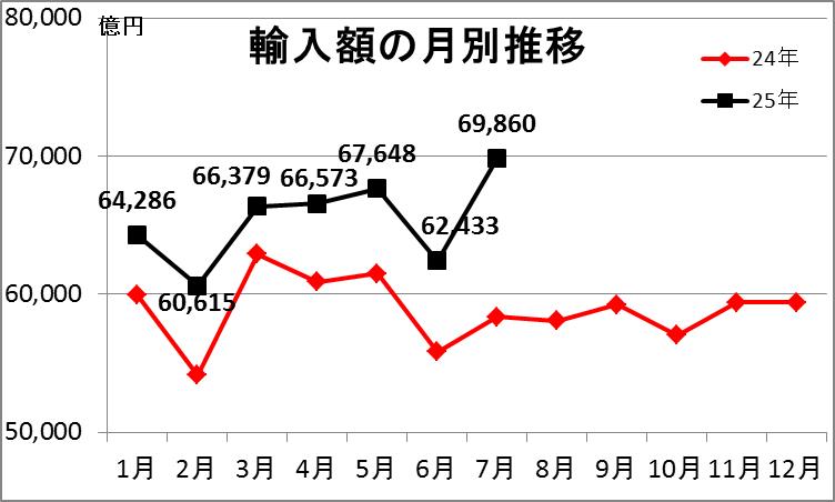 輸入額が平成25年に入り大きく前年同月比を超えていて、7月は+19.6%と大きくなり近年の最大である6兆9860億円にまで膨れ上がりました。