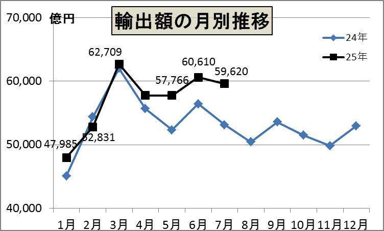 輸出額はずっと前年比と同じくらいで推移していましたが、5月にようやく前年よりも+5000億円くらい増えて、6月には+4000億円で7月は+6000億円となり、ここ3ケ月の前年同月比では+5000億円くらい増えています。