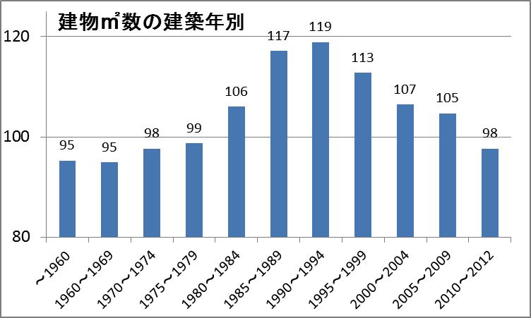 「ウサギ小屋」と言われた1960年以前の建物の平均は95㎡でした。ただこれは今年取引されたものですから建物が築50年経っていますので、建築時にしっかりつくられたものだけが取引対象となっていて、小さくて耐久性の悪いものは全て解体となりますので実際より大きくなっていると思われます。