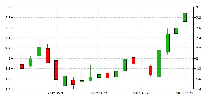2013年に入ってからは4月までは超低金利で推移していのですが、5月に急騰して2%を超えて、その後毎月上がっています。そして7月には2.6%となり、8月には2.8%を超えています。