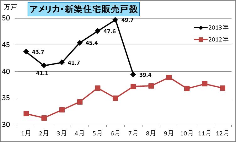 アメリカの新築住宅の販売戸数の2013年7月が急落しました。金利高騰によるものですが、好調で推移していだけに金融緩和終了後の影響の大きさの一端を垣間見させられるものとなりました。