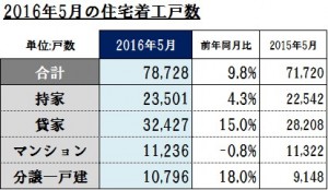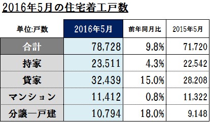 2016年5月の住宅着工が国土交通省から発表されました。戸数は7万8728戸で前年同月比+9.8%で5ケ月連続の前年同月プラスとなりました。全業態がプラスとなりましたが、貸家が前年同月比+15%と大きく伸びたのが主要因です。相続対策の賃貸住宅建設が依然として続いています。